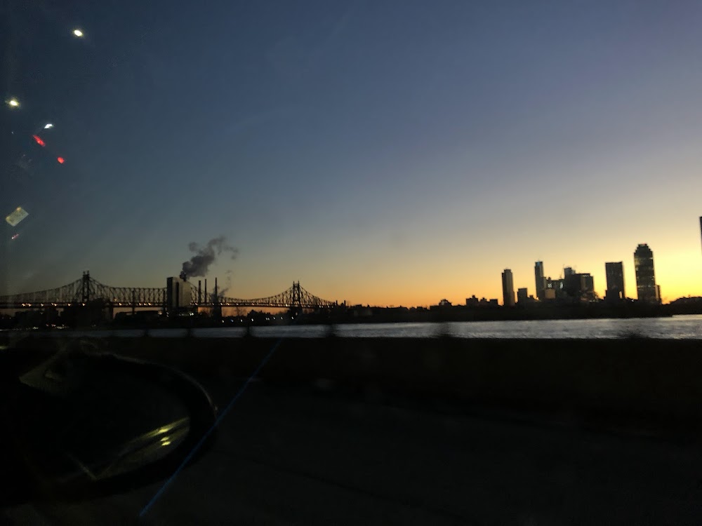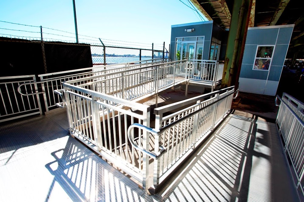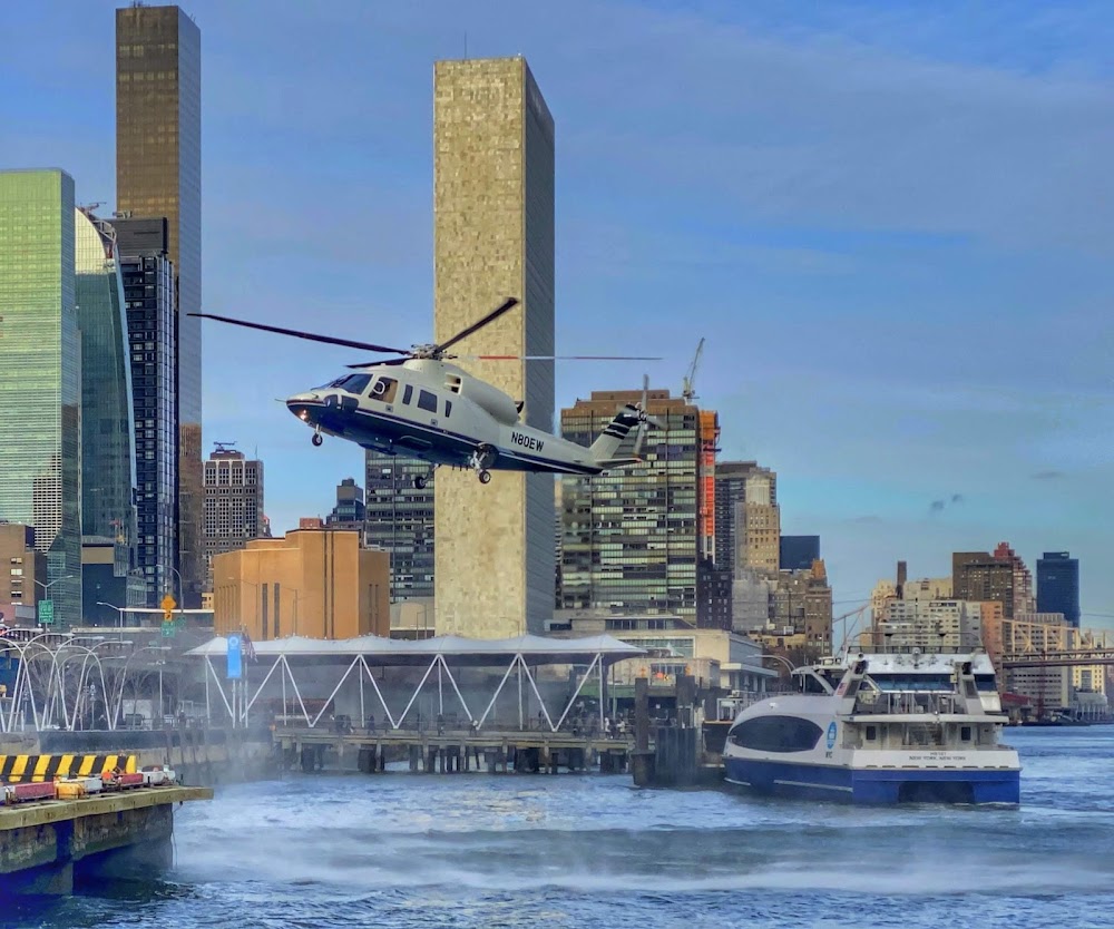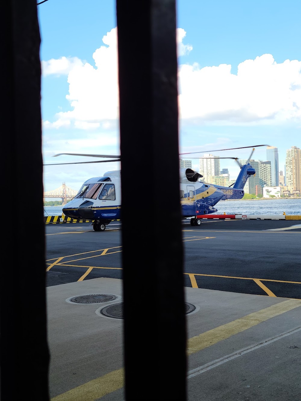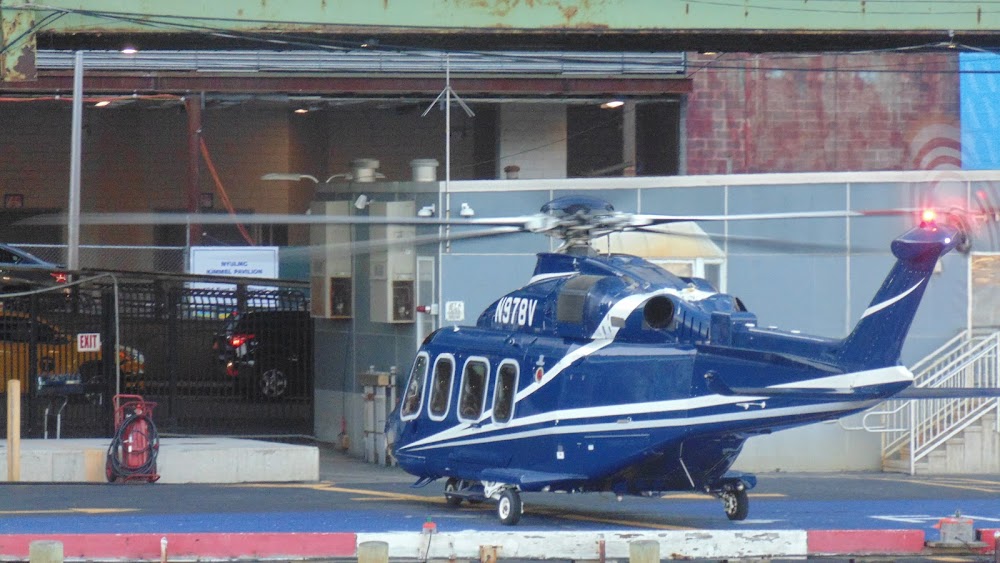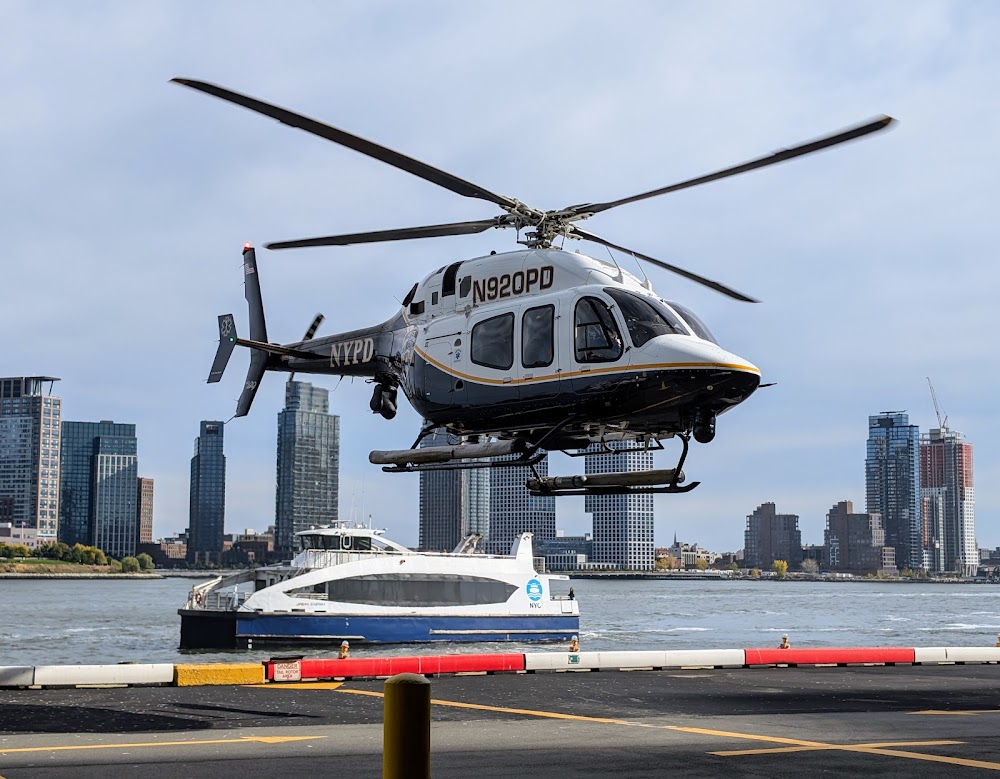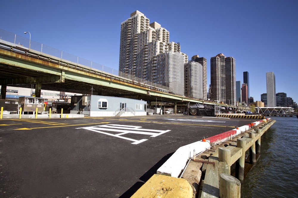 Rwy h1 lgtd bldg and fence nw and se; elevated highway and building to the west, fence and buildings to the north and south. river on the east side,sailboats and ferries possibly by edge of pad.
