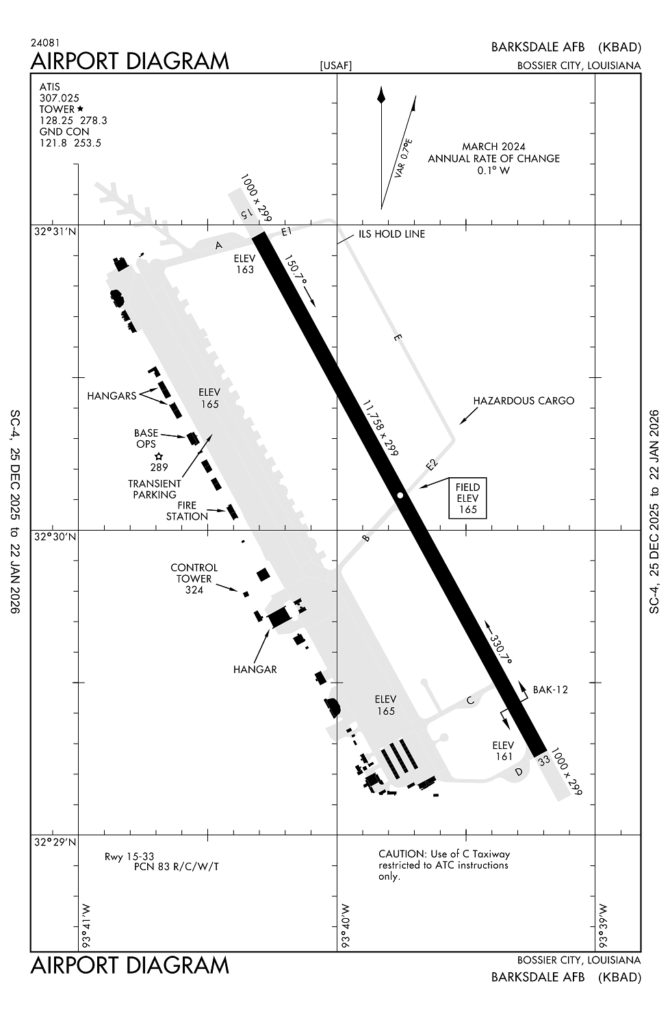 TAF COR KBAD 151245Z 1512/1618 22010KT 9999 SKC QNH3008INS BECMG 1601/1602 18010KT 9999 SKC QNH3001INS BECMG 1605/1606 17010KT 9999 SKC WS020/24040KT QNH3000INS BECMG 1615/1617 27015KT 9999 SKC QNH2995INS TX12/1521Z TN01/1612Z